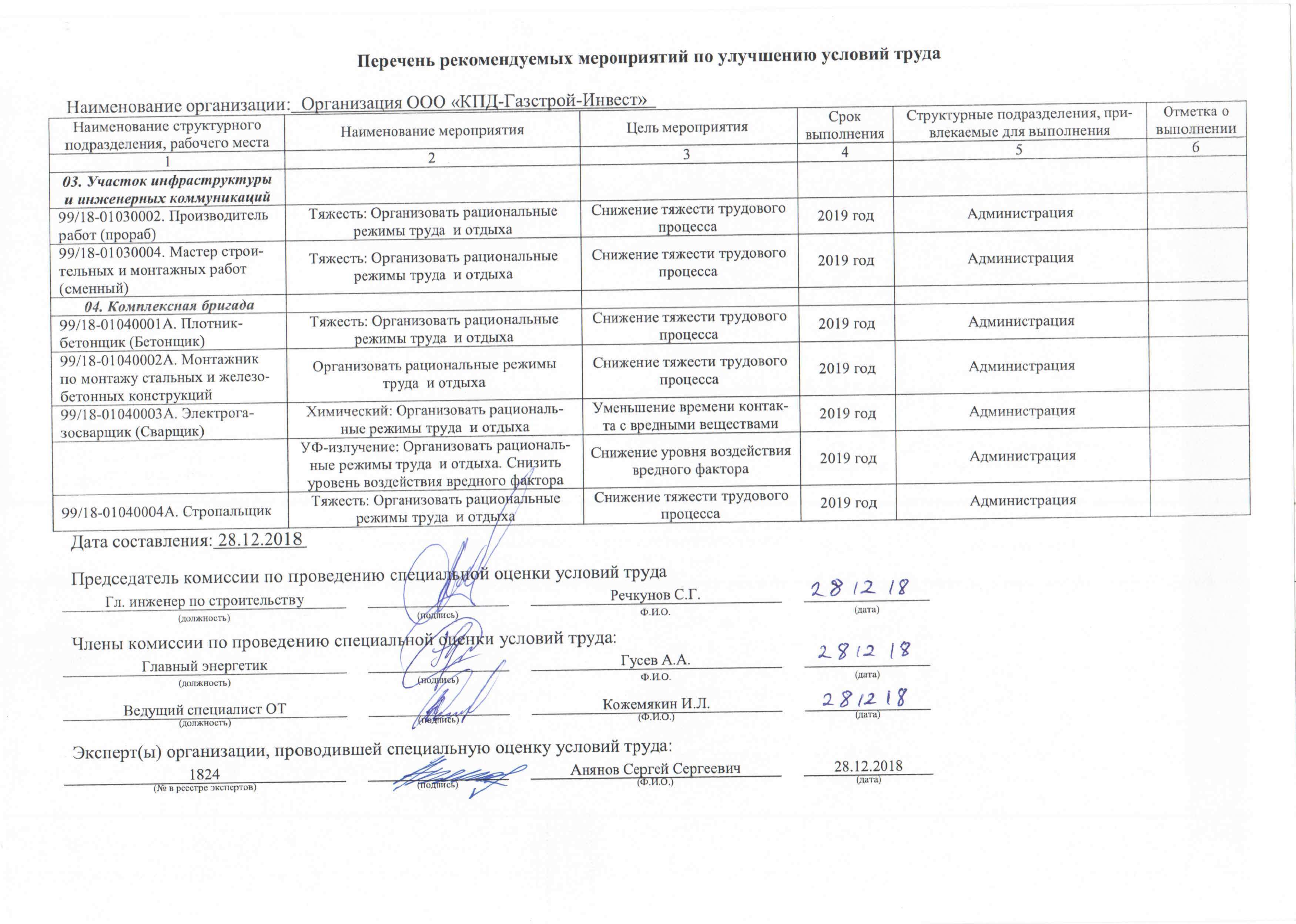 Перечень рекомендуемых мероприятий по улучшению условий труда в ООО СЗ КПД-Газстрой-Инвест за 2019