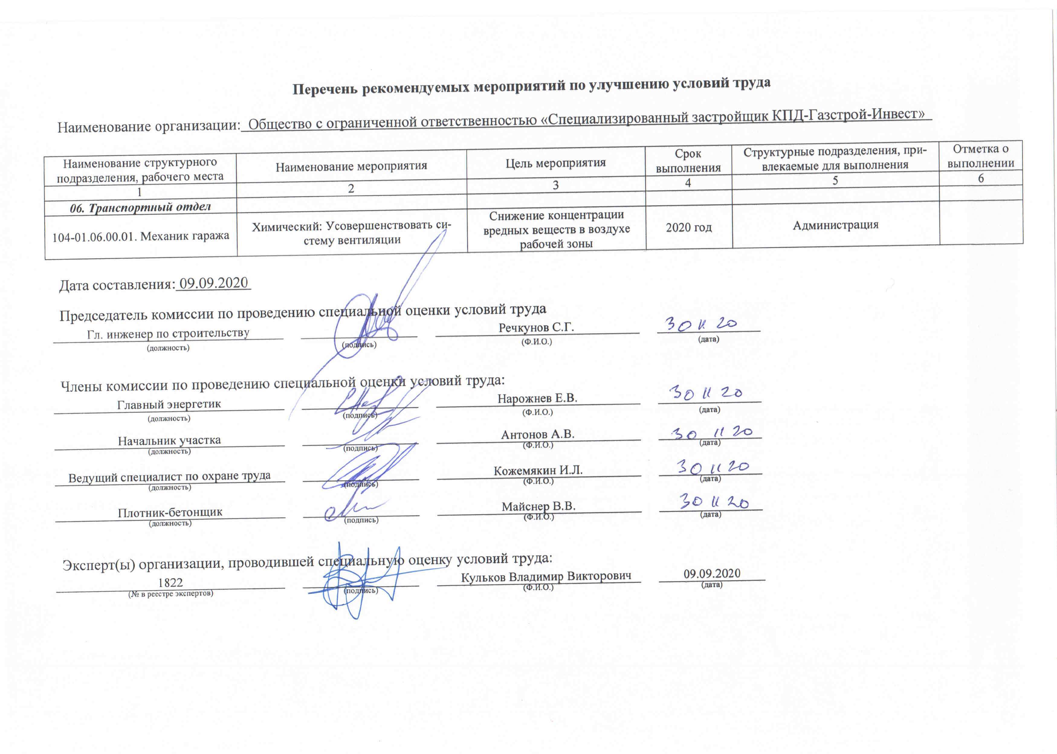 Перечень рекомендуемых мероприятий по улучшению условий труда в ООО СЗ КПД-Газстрой-Инвест за 2020