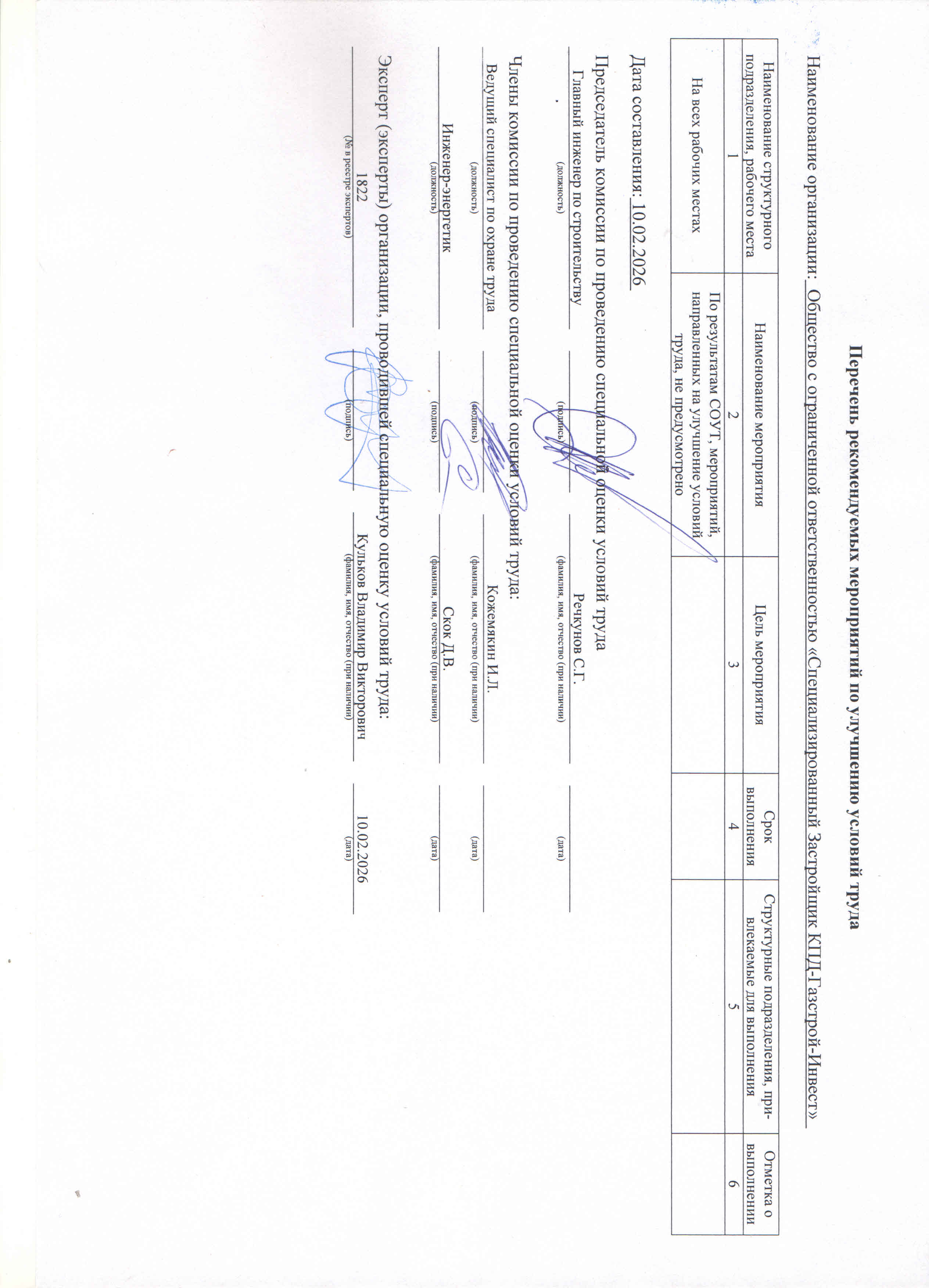 Перечень рекомендуемых мероприятияй по улучшению условий труда в ООО КПД-Газстрой за 2026
